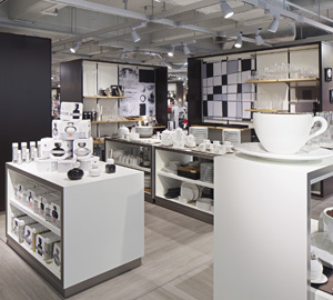 Homeware is nicely merchandised on kitchen cabinet styled wooden units of different heights, counter top and tall. Black and white in colour with beech shelving acting as a highlight, this area has a very utilitarian and contemporary feel. Giant cups and saucers add a touch of fun and frivolity.