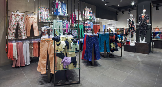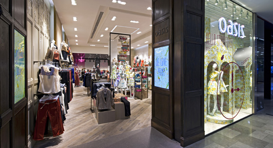 Taking inspiration from the earlier Argyll Street flagship, Oasis has also opened its doors at the new Westfield Stratford City. Dalziel and Pow has successfully combined the innovative look and feel of its two storey West End counterpart, within this single floor mall store. The new outlet features mood enhancing lighting plus treatments to fulfil its latest day and night theme and add a touch of class. As you enter this latest creation, you are immediately aware of a shift in style. The dark wooden panelled entrance stretching from floor to ceiling and allowing just a glimpse of what the store has to offer, is impressive to say the least and appears to elevate this main stream store to new heights. Great emphasis has also been placed on the window display. On visiting, the theme of the moment was fifties florals and Oasis was keen to flaunt its partnership with a specialist textile manufacturer. In very Harvey Nic’s fashion, the entire window had been taken over by an enormous stack of life size mattresses, each covered in an exquisite floral print, with the title ‘The Print – cess and the pea’. And, yes, there was a tiny pea popping out from the makeshift bed.