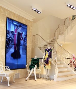 Internally, most design cues are taken from Oscar de la Renta’s home in the Dominican Republic. It can’t fail: bleached oak wooden flooring, ivory white walls and Dominican coral stone create an atmosphere that is the ultimate backdrop for the ultimate fashion label. Founded in 1965, Oscar de la Renta is noted for dressing America’s first ladies. The clothes are obviously very expensive and exquisitely tailored, but all around you are equally incredible pieces of display cabinetry and one very large, floor to ceiling, digital screen showcasing the latest ranges on the catwalk. An enormous glass showcase stands to one side. Everything is freestanding adding to the quality feel. Hanging rails are kept simple holding a modest amount of items. Display tables are low and minimal in both design and number. Oscar de la Renta's own distinctive furniture lines, with side chairs and tables emphasising traditional lines and detailing, have been used in place of display props. Headless mannequins are displayed sparingly throughout the store.