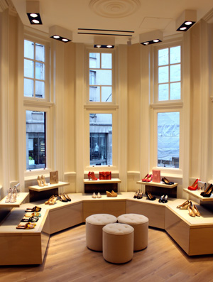 Upstairs, the shoe department is custom built to fit a large bay window offering splendid views of the locality. Once again, the perfect balance between product, craftsmanship, subtlety and design has been achieved and is laid out before you as you reach the top of the stairs. The staircase, as you may have already guessed, is a fine feature in its own right: ornately carved, cream coloured, it provides a textural accent against the bright, white modern walls.