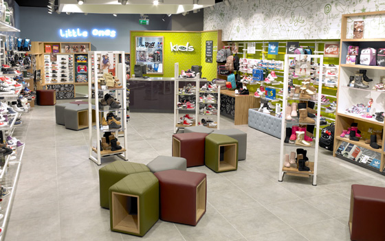 Shopfittings and display equipment play a key role in creating the relaxed ambience where customers feel totally at ease and the quirkiness is part and parcel of the design. The counter, located at the back of the store, is as a much a feature of this concept as the three sales areas above. It has a textured green wall, smart stainless steel top, shiny black front and its very own chalk blackboard to complete the look. Finally, individual seats shaped as arrowheads, that allow for storing empty boxes whilst kids are trying on the shoes, can be grouped together to form banks of seating. There are very few stores dedicated to children’s shoes and this store with its young, inquisitive approach should prove popular with kids and parents alike!
